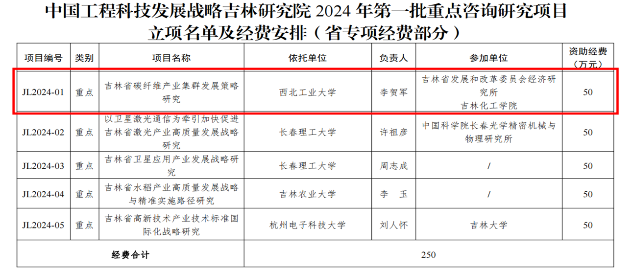 由我校联合西北工业大学、吉林省发改委经济研究所申报的“吉林省碳纤维产业集群发展策略研究”项目,经院士专家立项评审,吉林省科技厅党组审议,成功获批中国工程院院地合作2024年第一批咨询研究重点项目,经费50万元。