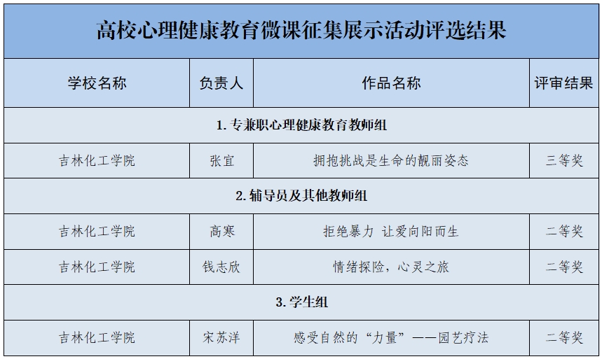 4月29日,吉林省高校心理健康教育微课征集展示活动评选结果揭晓,我校师生荣获二等奖3项,三等奖1项。