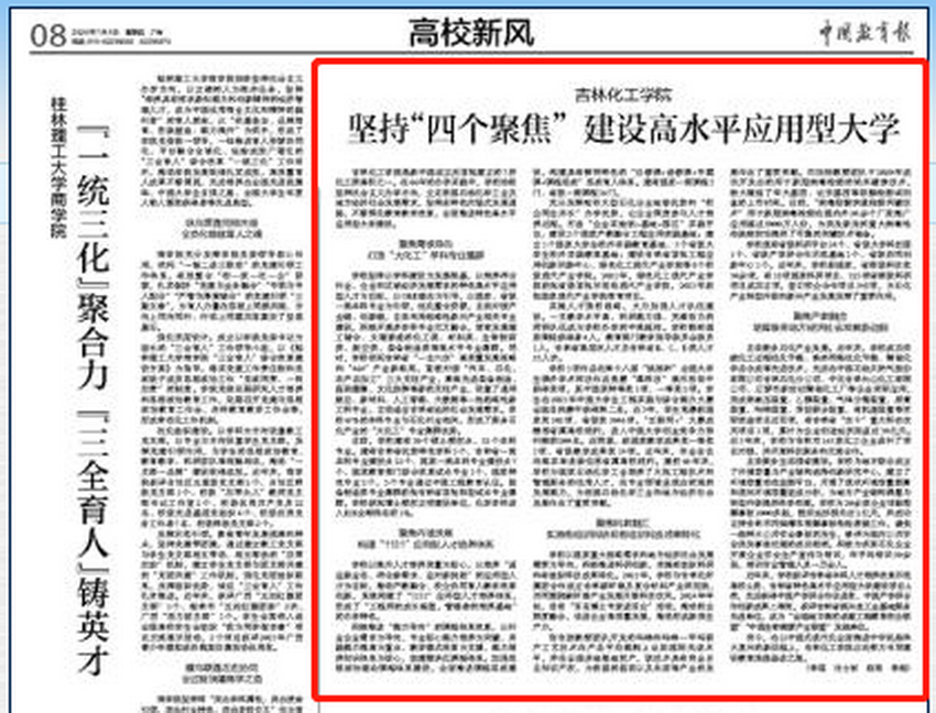 7月4日,《中国教育报》“高教新风”版头条以“吉林化工学院:坚持‘四个聚焦’ 建设高水平应用型大学”为题,从聚焦需求导向,打造“大化工”学科专业集群;聚焦内涵发展,构建“1131”应用型人才培养体系;聚焦科教融汇,实施有组织科研和有组织科技成果转化;聚焦产教融合,培育服务地方经济社会发展新动能四个方面入手,报道我校在66年的办学实践中,始终坚持社会主义办学方向,立足我国石油化学工业及地方经济社会发展需求,坚持特色内涵式发展道路,不断深化教育教学改革,全面推进特色高水平应用型大学建设取得的丰硕成果。
