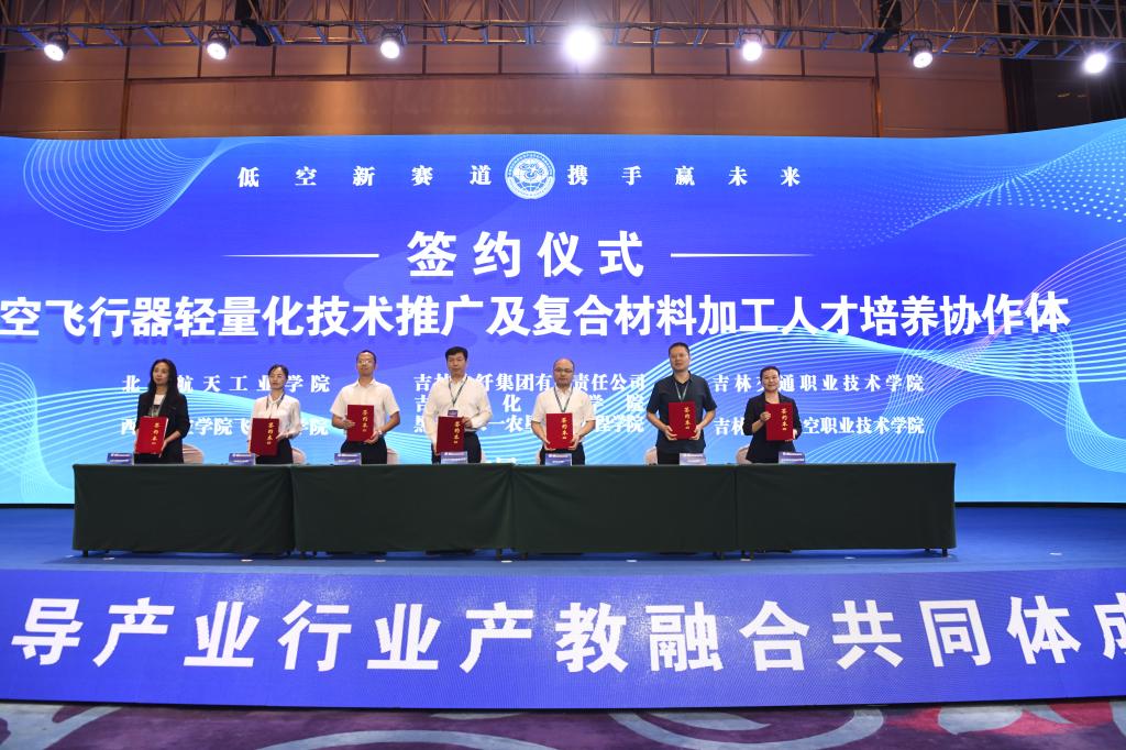 副校长王立国代表吉林化工学院,与吉林化纤集团有限责任公司、黑龙江八一农垦大学等院校,共同签署《低空飞行器轻量化技术推广及复合材料加工人才培养协作体合作框架协议》。