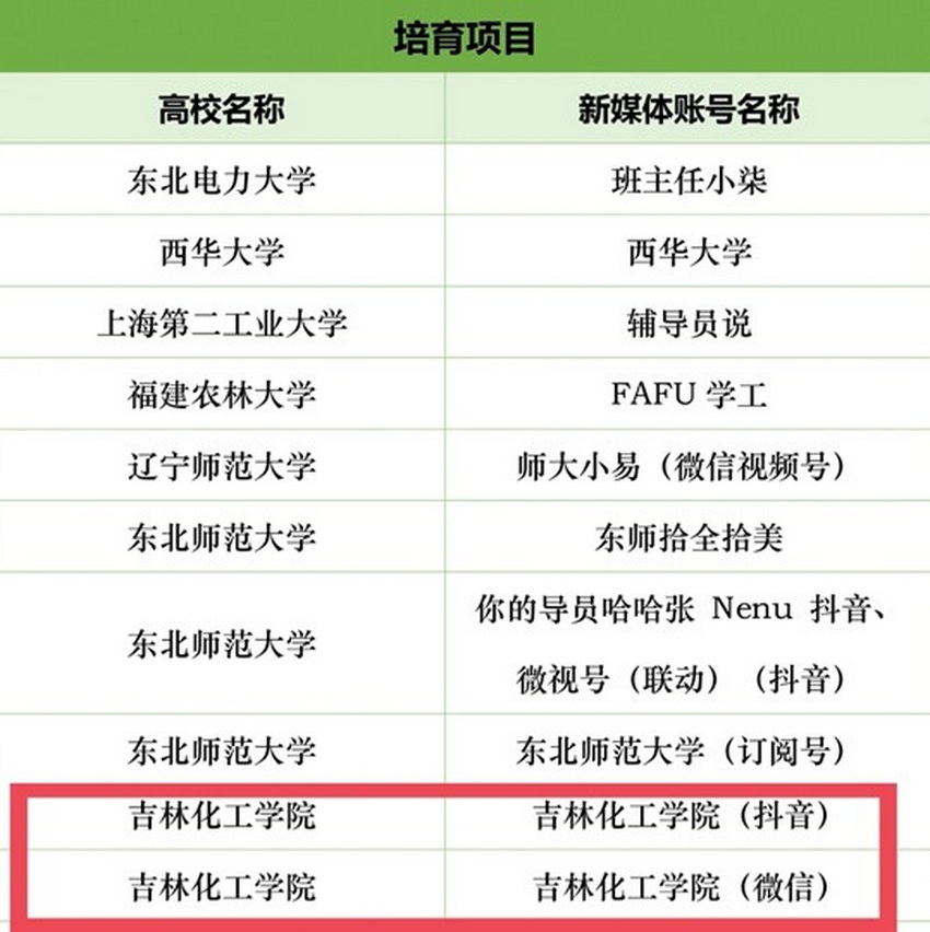 为深入贯彻落实习近平新时代中国特色社会主义思想,重点建设一批高校思政类新媒体账号,打造有传播力、影响力、引导力、公信力的网络新媒体平台,易班面向全国共建高校遴选新媒体账号及优质思政内容,并组织相关领域专家从内容建设基础、内容建设方案、学生工作团队、预期成果等方面综合进行评审。经过高校申报、线上答辩、专家评审等环节,最终10所高校的项目被评选为支持项目, 75所高校的项目被评选为培育项目。我校新媒体账号“吉林化工学院抖音” “吉林化工学院微信公众号”获评 “优质思政内容建设培育项目”。