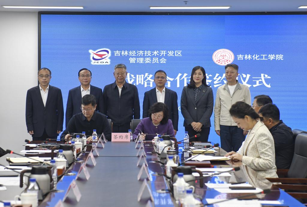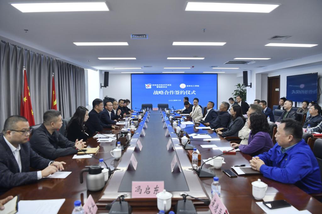 为深入贯彻落实党的二十届三中全会精神,推进产业科技人才教育相互赋能、高效融合,10月17日,吉林化工学院与吉林经开区管委会签署战略合作协议。省科技厅二级巡视员辛德久,吉林化工学院党委书记宋春辉,校长艾学忠,党委常委、副校长孙大志,市科技局局长施春敏,经开区党工委书记、管委会主任简俊峰出席活动。