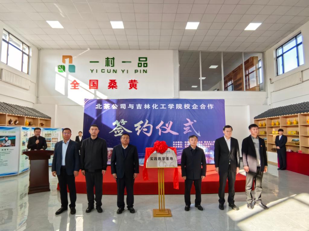 与会领导共同为校企合作基地揭牌。会前,蔡立峰一行实地调研走访了北茶(吉林)农业发展有限公司,实地踏查企业经营情况以及相关产品情况,结合企业实际进行了技术研讨交流。