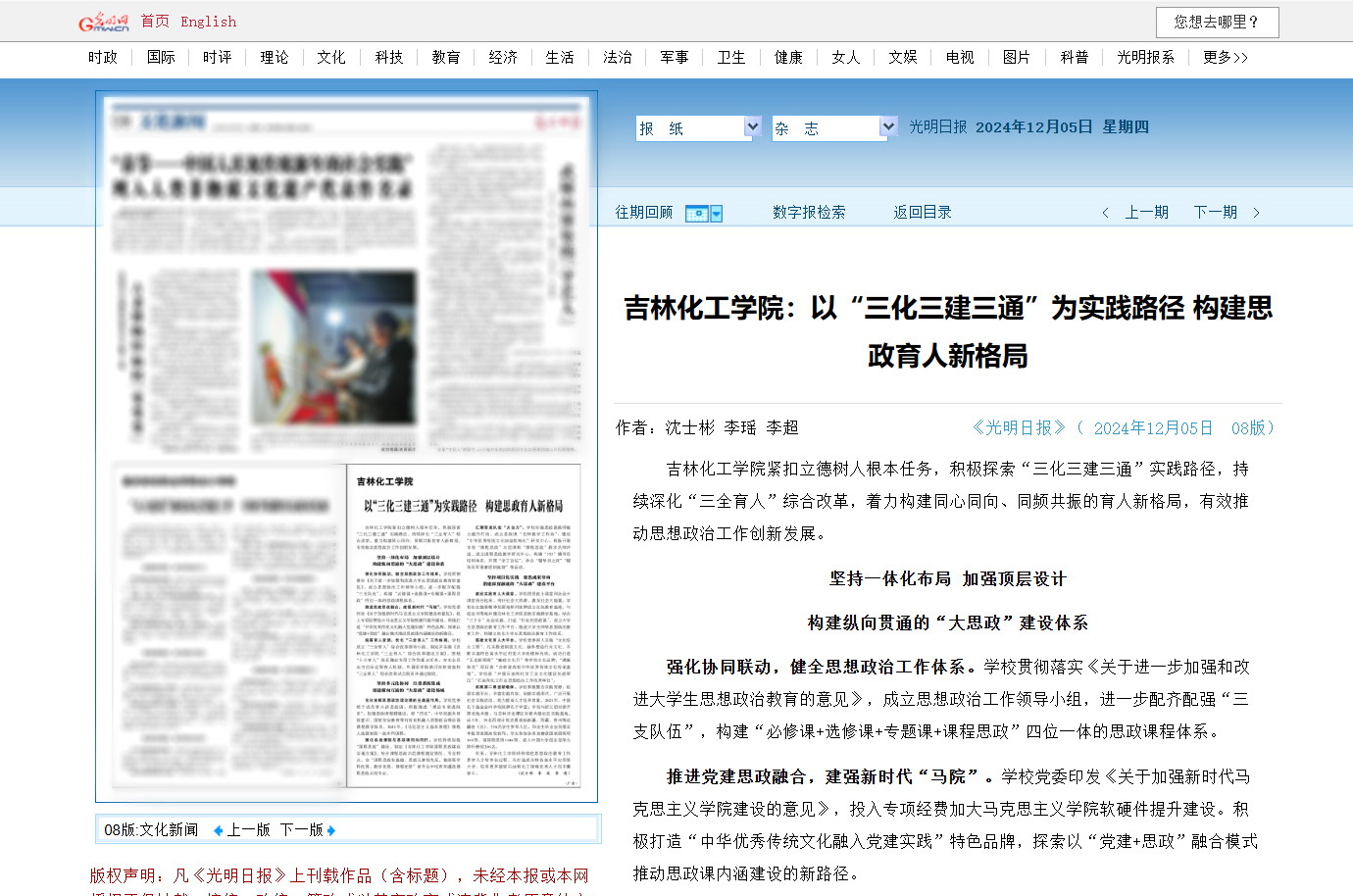 12月5日,《光明日报》文化新闻版面,以《吉林化工学院:以“三化三建三通”为实践路径 构建思政育人新格局》为题,从“坚持一体化布局,加强顶层设计构建纵向贯通的‘大思政’建设体系;坚持多元化协同,注重系统集成组建横向互通的‘大思政’建设场域;坚持项目化实践,聚焦成果导向搭建深度融通的‘大思政’建设平台”三个方面,报道我校积极探索“三化三建三通”实践路径,持续深化“三全育人”综合改革采取的举措及取得的成效。