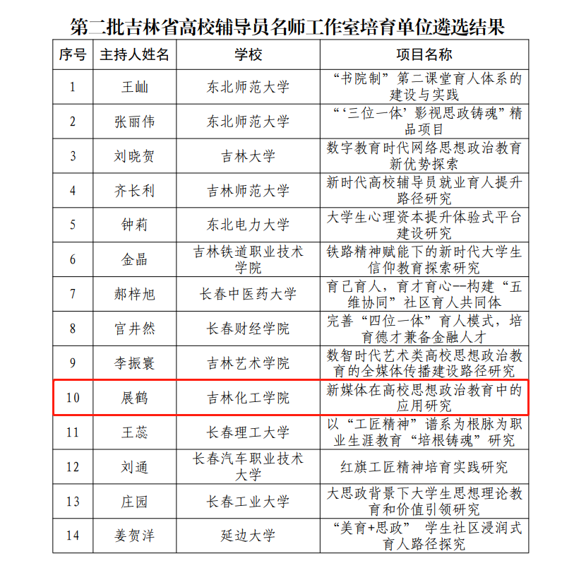 近日,吉林省教育厅公布了《关于吉林省第二批高校辅导员名师工作室遴选结果的公示》,经高校申报、专家评分,全省有14个团队入选高校辅导员名师工作室培育单位。我校材料科学与工程学院辅导员展鹤主持的“新媒体在高校思想政治教育中的应用研究”项目成功入选。