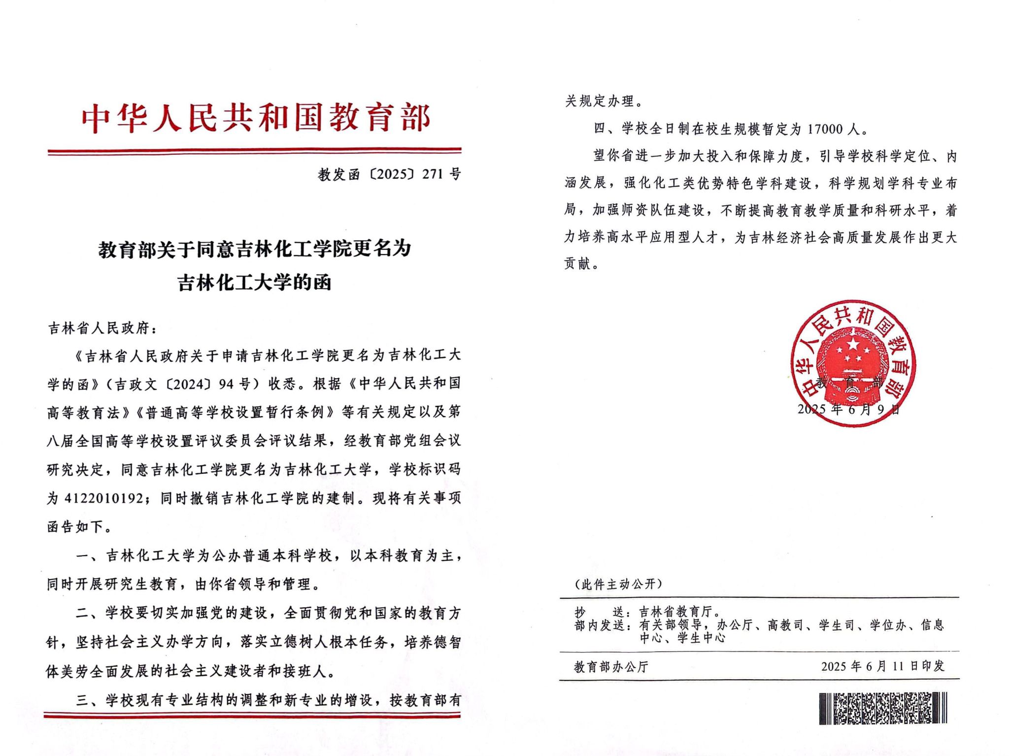 近日,教育部向吉林省人民政府发送《教育部关于同意吉林化工学院更名为吉林化工大学的函》,经教育部党组会议研究决定,同意吉林化工学院更名为吉林化工大学。