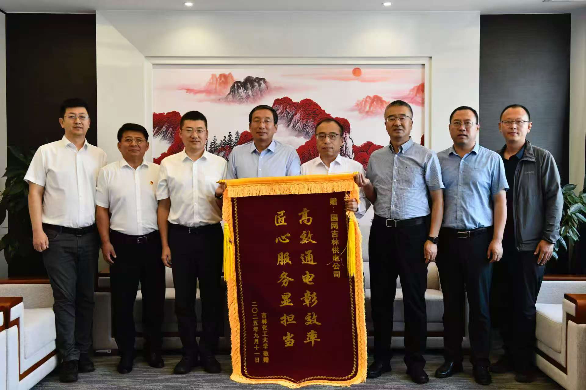 艾学忠代表学校向国网吉林供电公司赠送感谢信和题有“高效通电彰效率 匠心服务显担当”的锦旗,表示诚挚谢意。