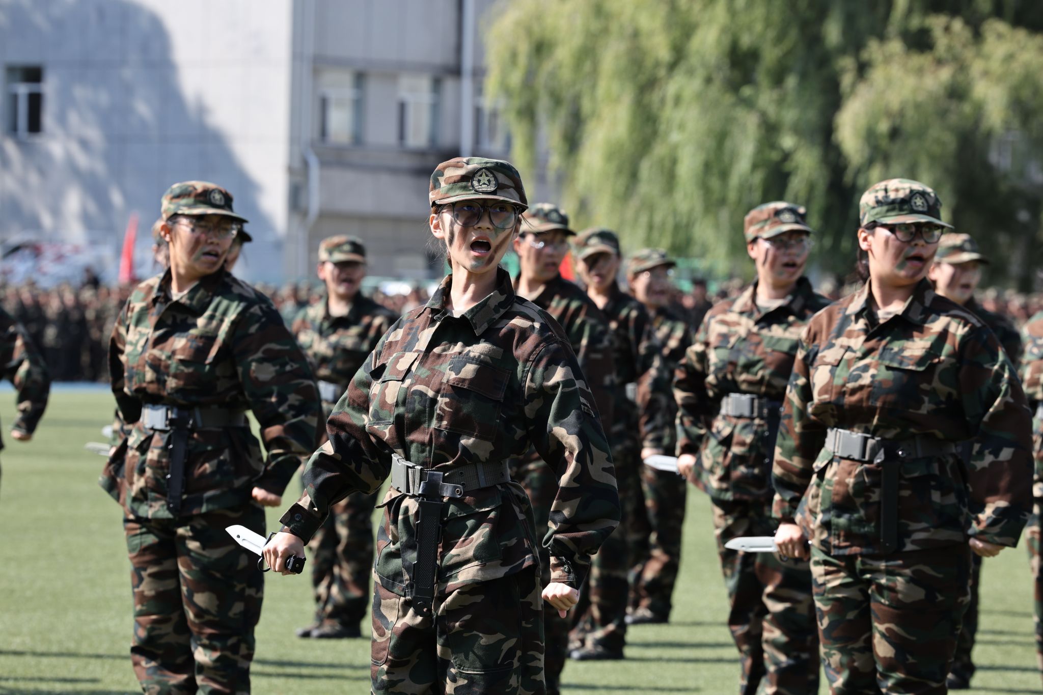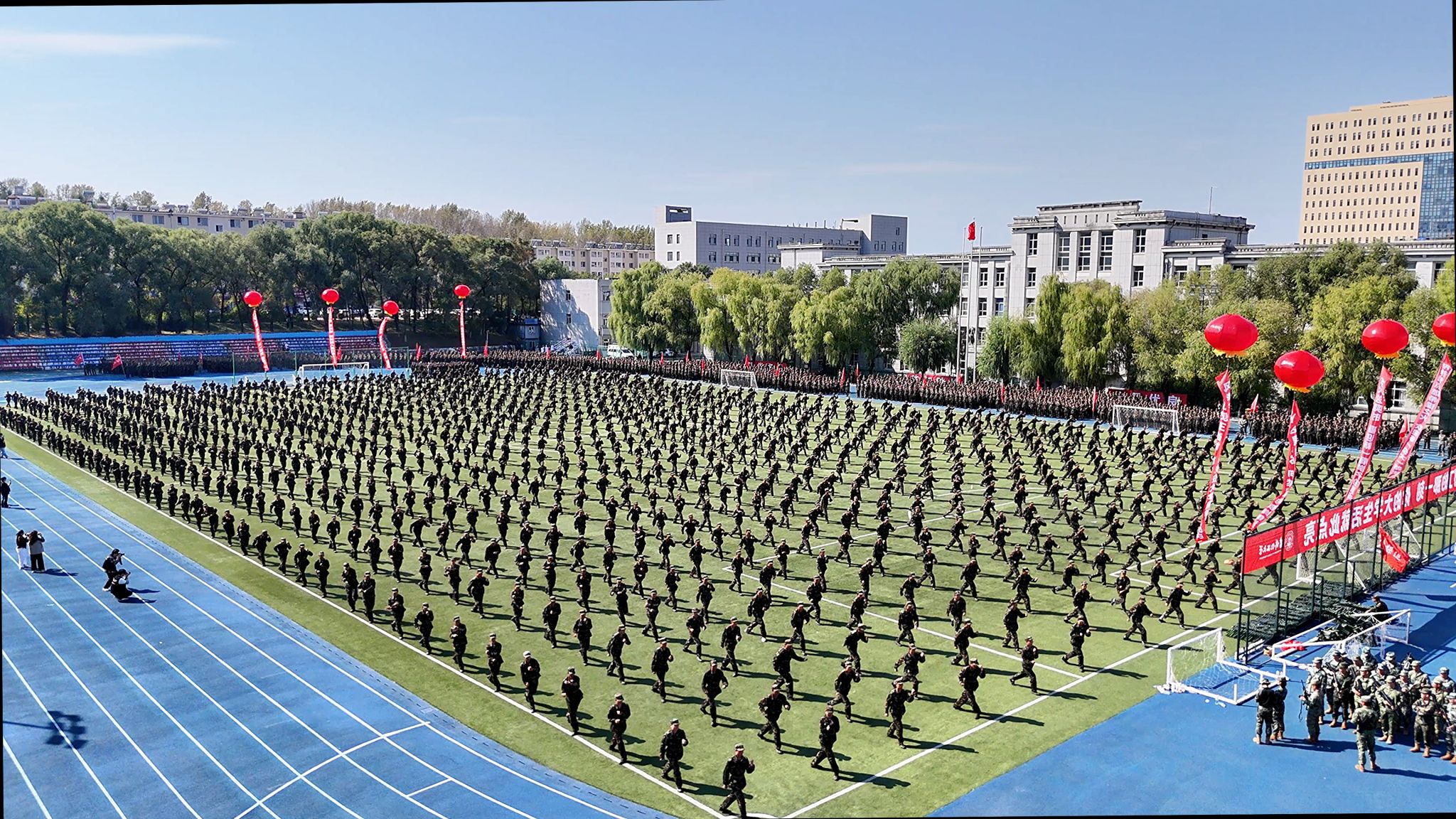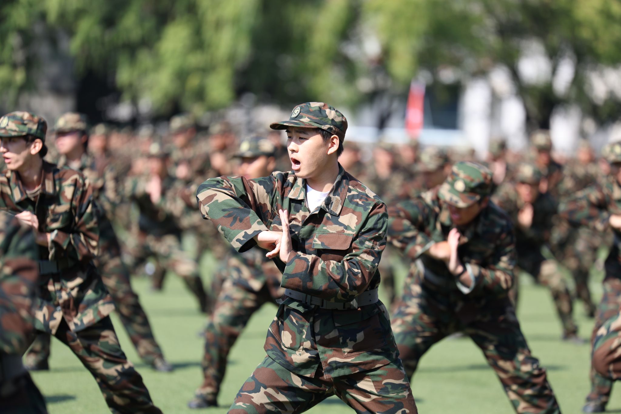 军训成果汇报环节亮点纷呈,在国旗护卫队的引领下,由11个学院组成的43个分列式方阵依次通过主席台,严整的队列、嘹亮的口号、刚健的步伐,展现出化大学子如松的意志、如铁的纪律。旗语方阵变幻多彩,千人军体拳、应急棍术、擒敌拳、匕首操、教官战术表演刚猛有力,精准凌厉,14天的军训成果在精彩展演中完美呈现。现场掌声阵阵,既是对他们努力的肯定,更是对青春奋斗的礼赞。