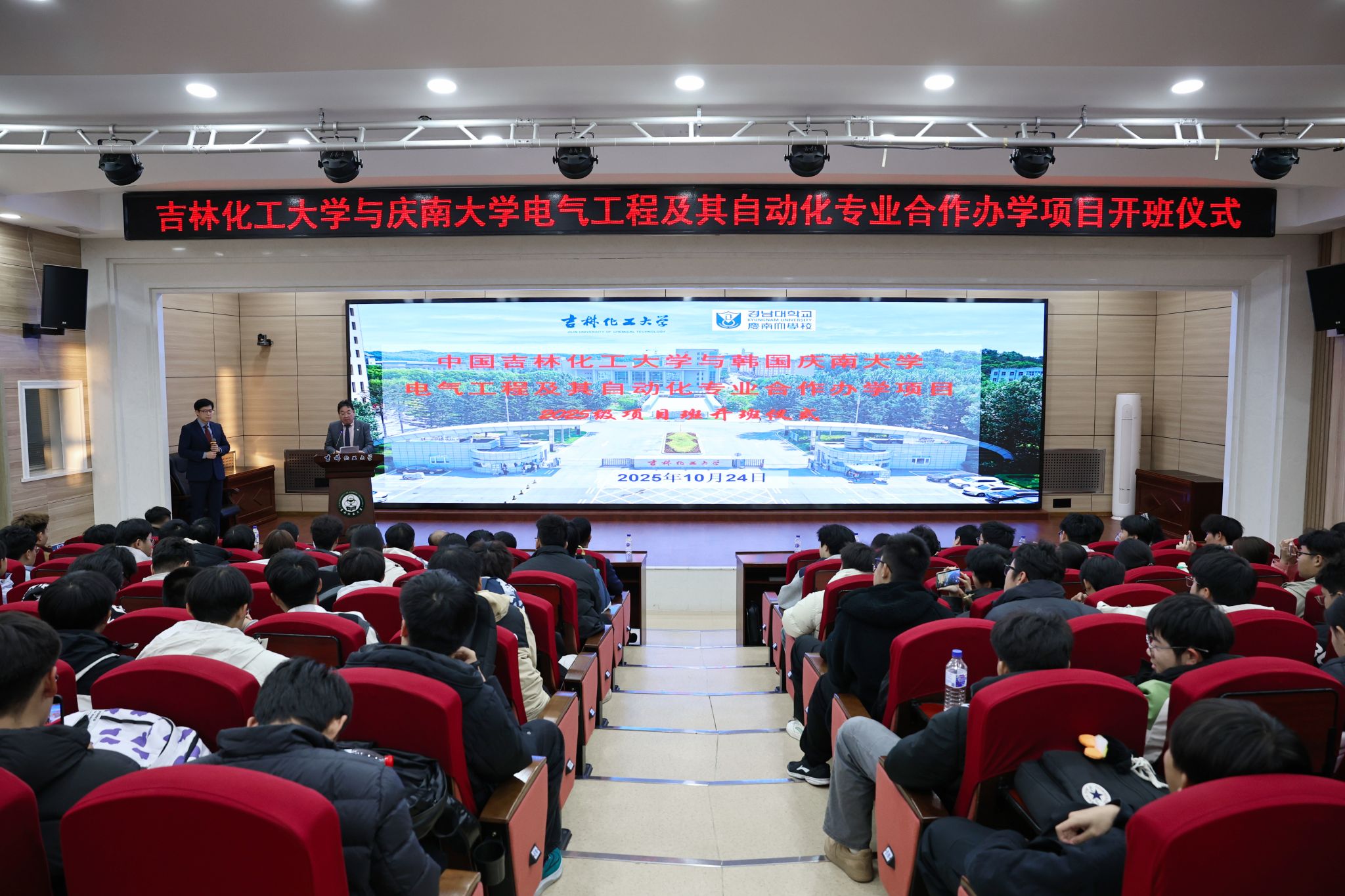 10月24日,学校中韩电气工程及其自动化专业合作办学项目合作院校——韩国庆南大学副校长高湖锡一行来校访问。学校党委常委、副校长孙大志会见高湖锡一行,双方共同出席电气工程及其自动化专业合作办学班2025级新生开班仪式。