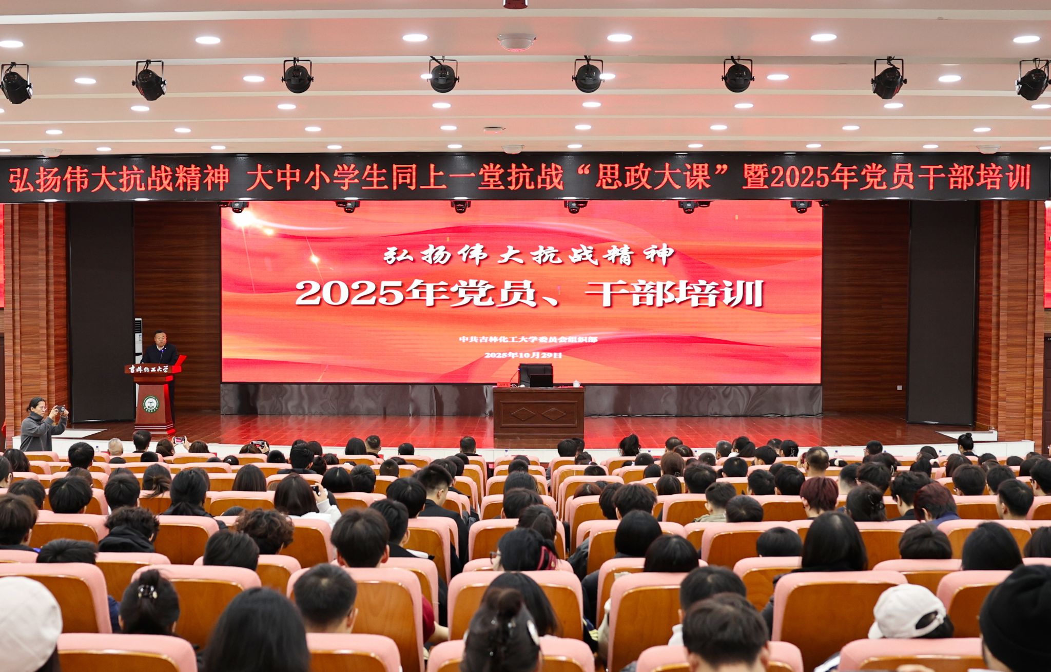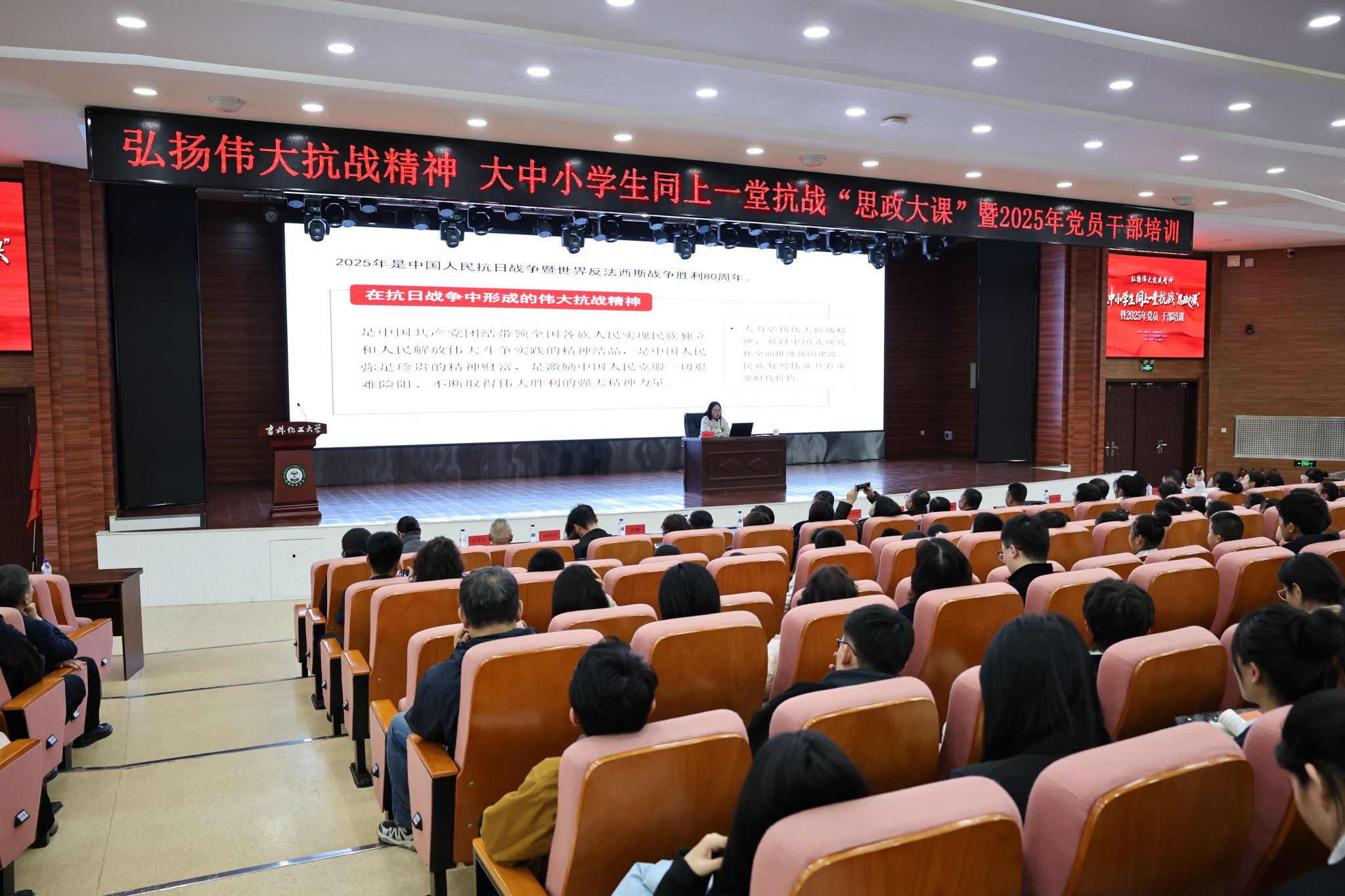 10月29日,学校举行大中小学同上一堂抗战“思政大课”暨2025年党员干部培训。我校师生与双吉中学、第五十二中学、吉化一小、松江东路小学及双吉小学的校领导、教师代表与学生代表齐聚一堂,共同聆听历史回响,感悟抗战精神的磅礴力量。学校党委副书记蔡立峰出席并主持报告会。