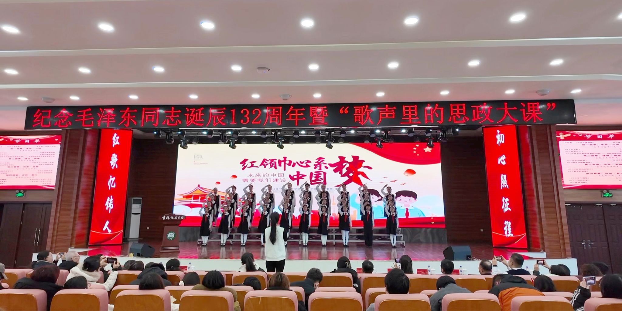 本堂思政大课由学校马克思主义学院毛泽东思想和中国特色社会主义理论体系概论教研室李晓云教授与涂庆皓教授联袂授课,以“革命・立国”“建设・探索”“改革・发展”“奋进・复兴”为脉络展开。学校“毛概”课程班级学生与双吉小学“向阳生合唱团”、松江东路小学校“小魁星童声合唱团”、吉化第一实验小学校学生接力唱响《东方红》《没有共产党就没有新中国》《我们的田野》《春天的故事》《少年中国梦》等红色歌曲,李晓云、涂庆皓两位教授分别结合篇章主题解读歌声中的民族精神、真理追求与时代使命,引导师生感悟红色传承与家国情怀。过程中,学生们分享感悟、表态立志,直观理解党的初心与使命。课堂以全场师生齐唱《歌唱祖国》结束,用激昂歌声传递对伟人的崇敬与对祖国的热爱,让红色真理与时代精神深度交融。