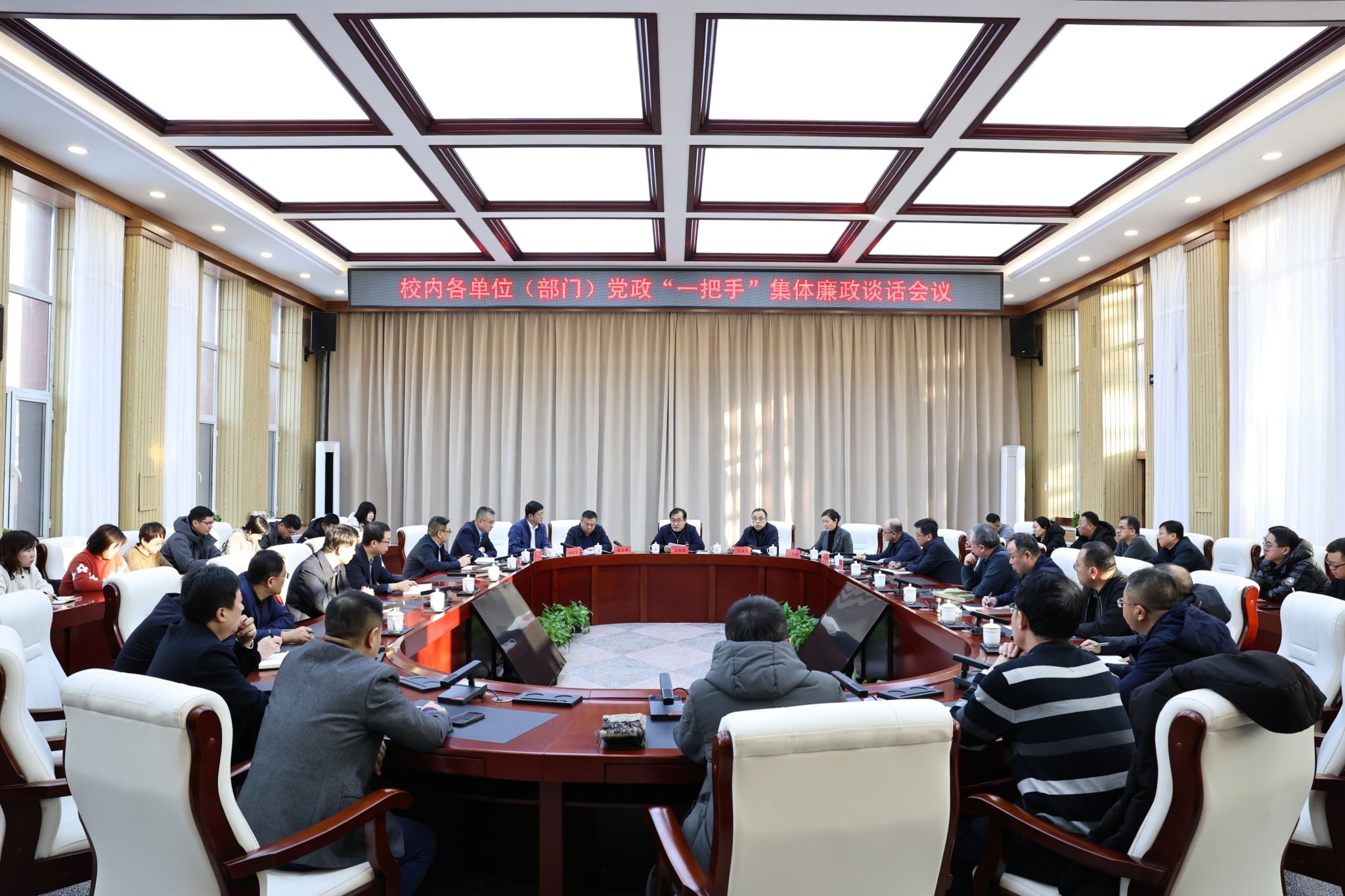 1月19日,学校在办公楼第三会议室召开校内各单位(部门)党政“一把手”集体廉政谈话会议。党委书记张明耀主持会议并讲话,校长艾学忠出席会议。