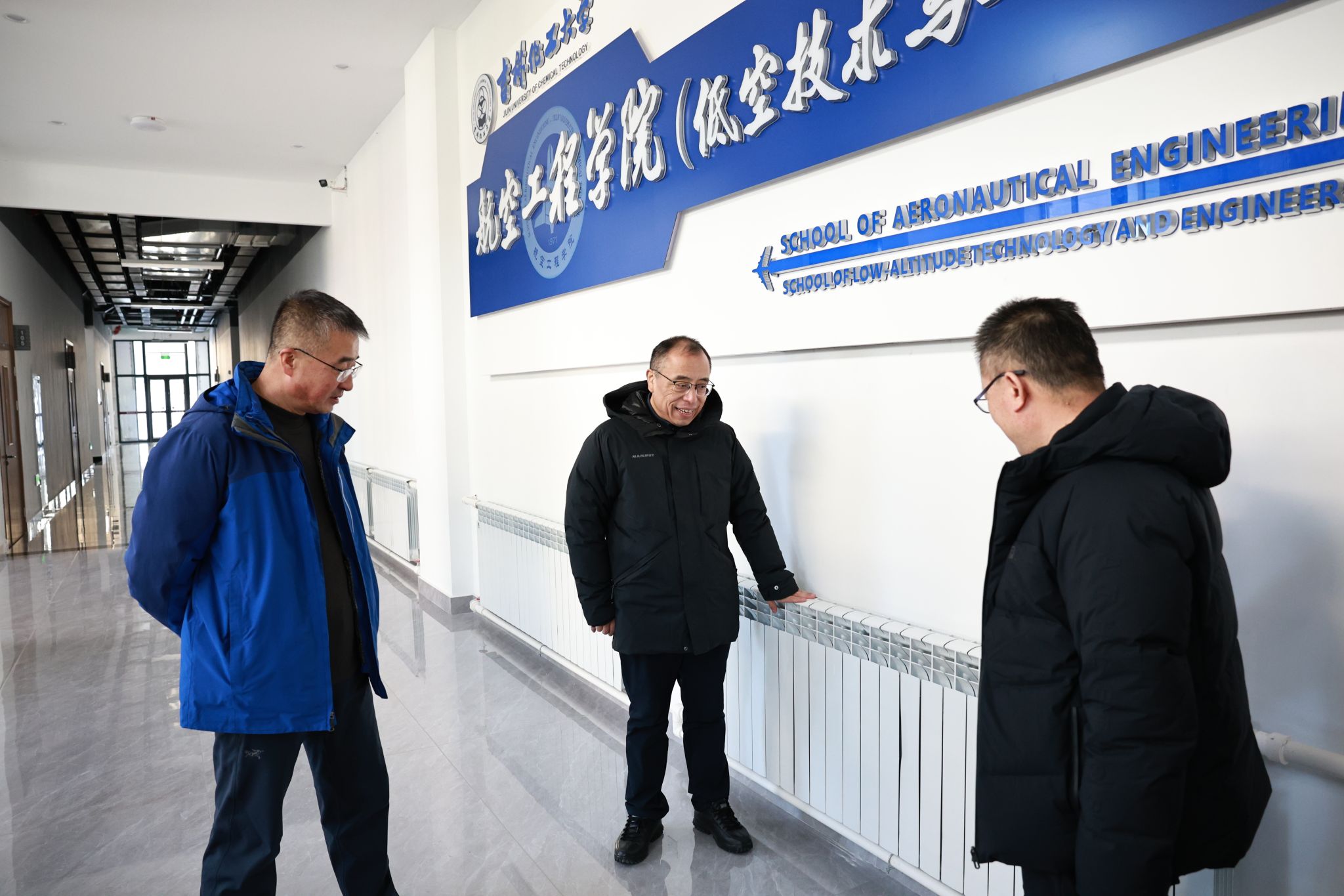 在丰满校区,艾学忠深入九思楼、航苑楼、荟智楼检查校园安全工作情况。在经济管理学院、航空工程学院、人工智能学院,听取假期开放教学楼的安全管理与服务保障工作汇报。叮嘱相关部门要坚持以师生为中心,加强安全维护,强化责任落实,细化管理措施,优化完善服务保障机制,确保留校师生享有便利、安全学习生活条件。